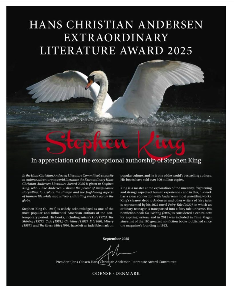 Stephen King, prin opera sa, îți demonstrează că granițele dintre genuri literare sunt fluide și că un scriitor poate explora atât întunericul, cât și lumina cu aceeași măiestrie. Premiul Hans Christian Andersen, o recunoaștere a forței universale a poveștilor, unește basmul cu horror-ul, inocența cu întunericul, într-o celebrare a imaginației umane. Așa cum spunea chiar Stephen King într-un interviu: „Frica este emoția umană cel mai ușor de exploatat. Dar și cea mai importantă, pentru că ne ține în viață.” Tot el a mai adăugat: „Eu scriu ca să aflu ce se va întâmpla.” Această curiozitate neobosită și dorința de a explora necunoscutul îl transformă pe Stephen King într-unul dintre cei mai importanți scriitori contemporani.